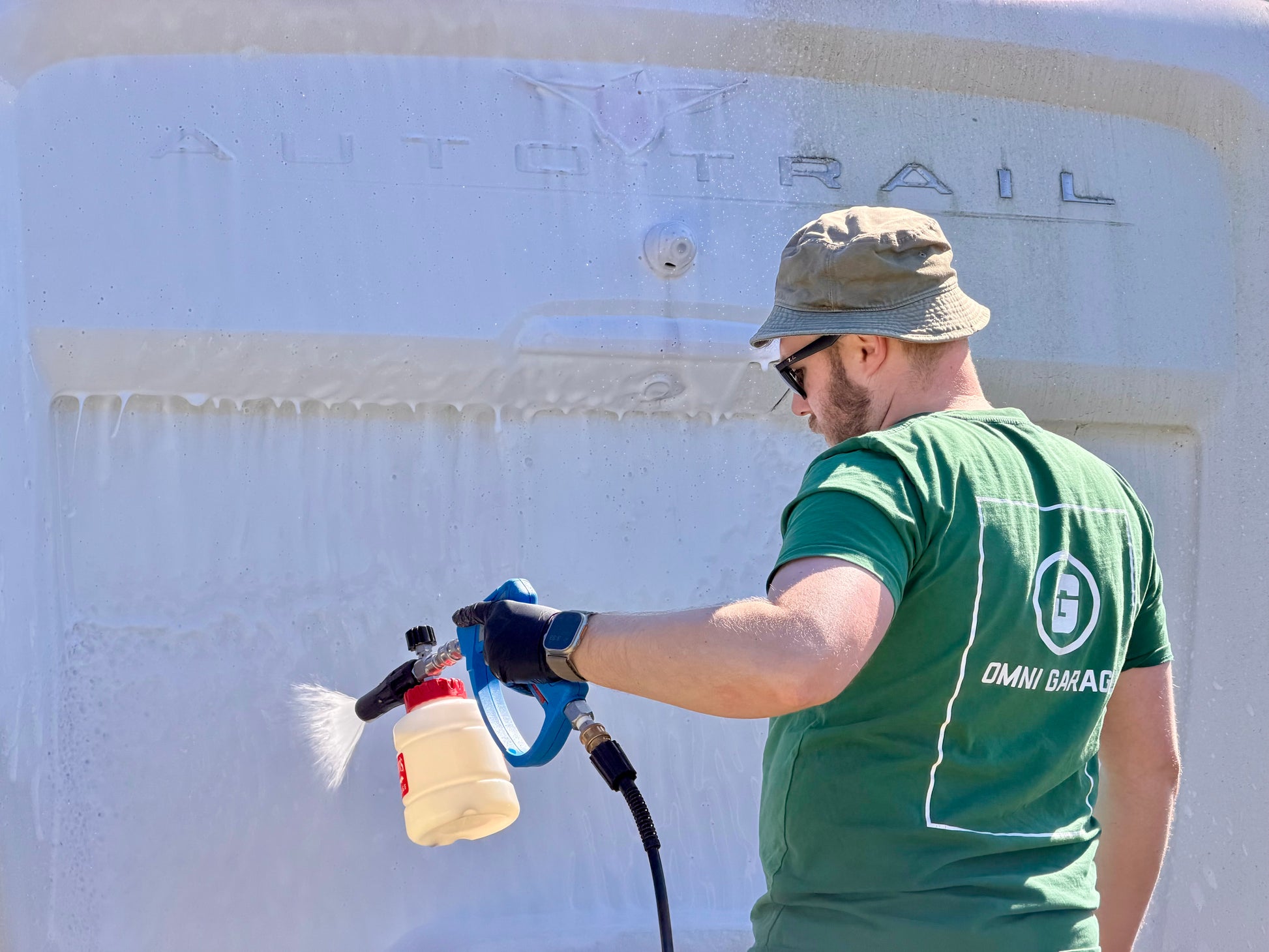 The process begins with a thorough decontamination wash of the entire exterior of your motorhome, RV, campervan or caravan, including the wheels, trims and paintwork. We then chemically dissolve and remove tar and iron deposits — common on touring vehicles due to long-distance travel and extended time on the road — ensuring the surface is free from bonded contaminants. Any remaining embedded particles are carefully removed using a synthetic clay bar, leaving the exterior smooth, clean and fully prepped for coating.